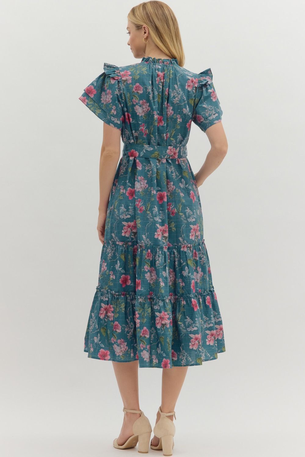 Floral print short flutter sleeve midi dress featuring ruffled collar V-neckline with tie, waist tie. Side pockets. Lined. Woven. Non-sheer. Lightweight.